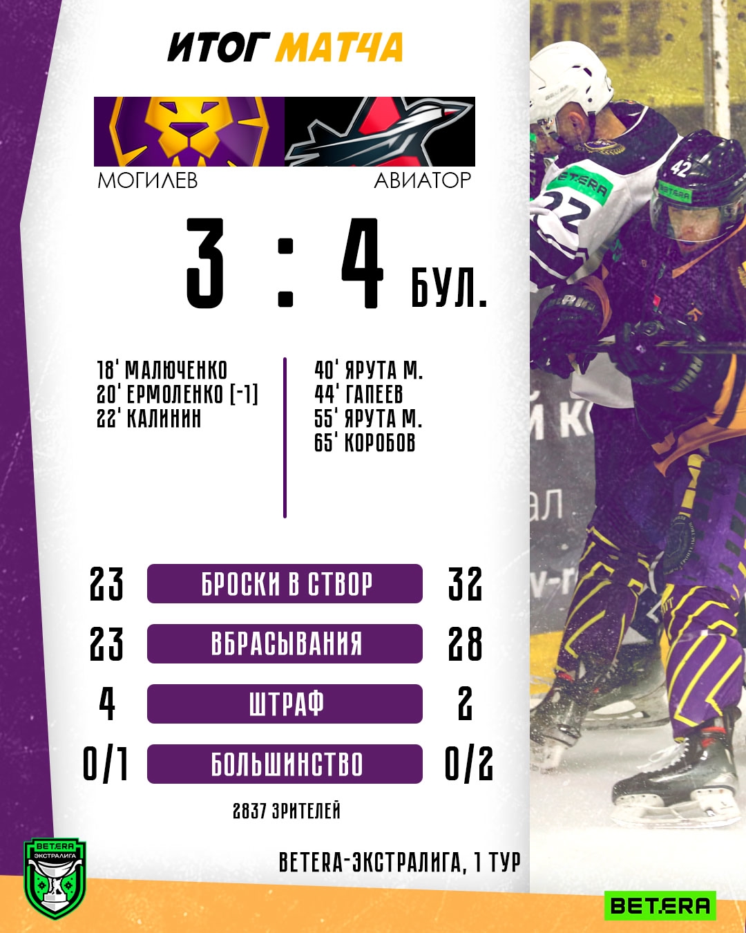 Могилев – Авиатор – 3:4 ПБ (2:0, 1:1, 0:2, 0:0, 0:1)1:0 – 17:16 Малюченко (Матлахов)